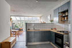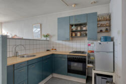 De keuken is een deel van de kamer, afgescheiden door een muurtje. Van achter het aanrecht kijk je naar het mooie groen buiten. De keuken is eenvoudig en efficient ingedeeld met een gasfornuis en een electrische oven.